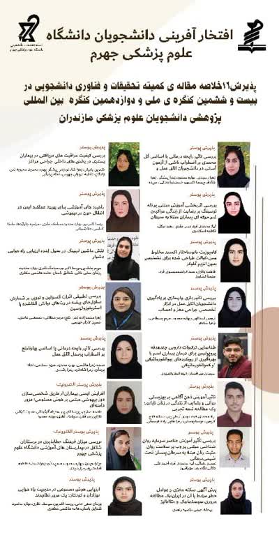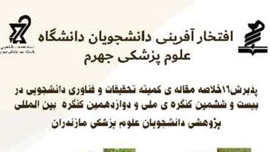 پذیرش 16خلاصه مقاله کمیته تحقیقات و فناوری دانشجویی دانشگاه علوم پزشکی جهرم در بیست و ششمین کنگره ملی و دوازدهمین کنگره بین المللی پژوهشی دانشجویان علوم پزشکی مازندران